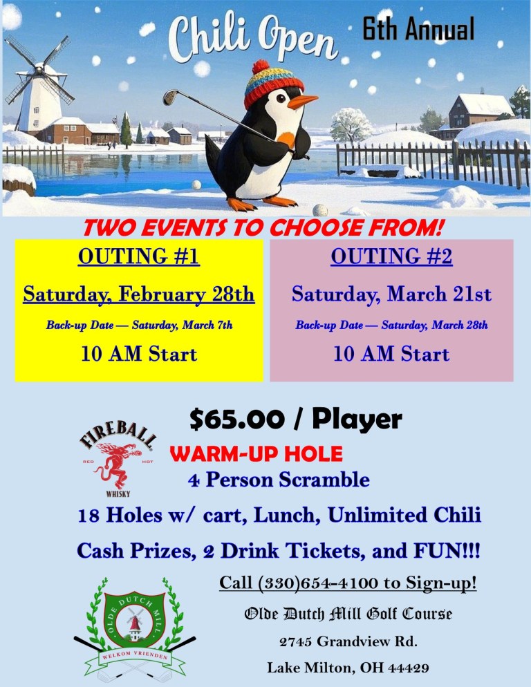 Olde Dutch Mill Golf Course is one of the most enjoyable and finest tests of golf in northeast Ohio. The tree lined, soft, lush fairways are carefully manicured. In addition to 18 holes of spectacular golf, you’ll love the journey through nature. Olde Dutch Mill’s course, driving range and full restaurant are open to the public year round.